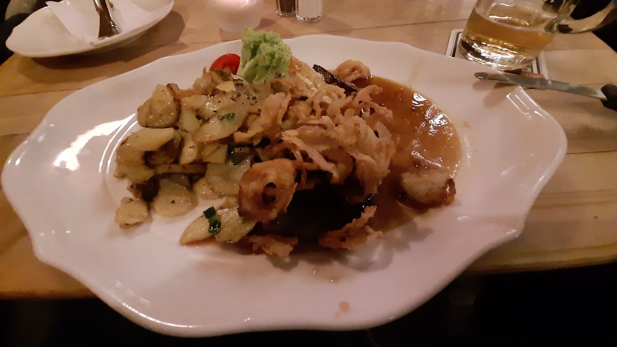 The menu is a celebration of local flavors and hearty German fare, featuring standout dishes that will tantalize your taste buds. Begin your meal with the Giant Meatpan "Lumberjack", an impressive assortment of cutlets, bacon, filets, sausages, and horse radish served alongside sauerkraut and fried potatoes for just €55, perfect for sharing with a companion. If you're looking for a taste of classic elegance, the Chateaubriand, available for advance order, is an exceptional choice, served with a medley of vegetables, a rich sauce Béarnaise, and French fries for €69.