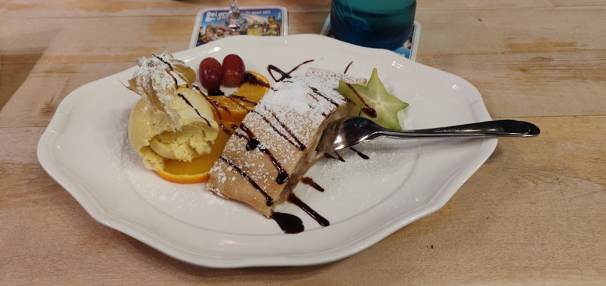 Don't miss the chance to indulge in one of their delectable desserts. The apple strudel with ice cream (€5.90) is a perfect sweet ending to your meal, and the apple fritters accompanied by creamy ice cream will make your taste buds dance with joy.